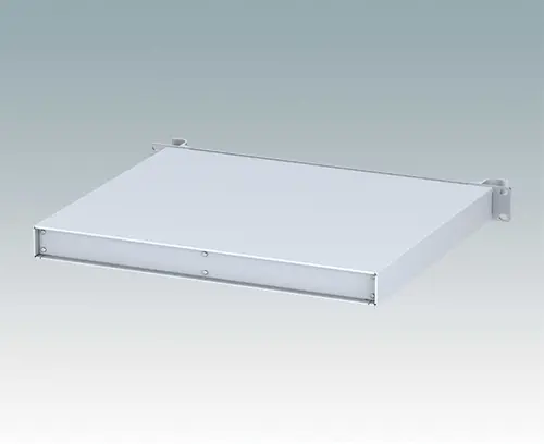 Universelles 19” Rack-Gehäuse mit eloxierten Alufrontblechen und zwei ergonomischen Frontblechgriffen. Der Gehäusekörper besteht aus einer soliden oberen Abdeckung mit abnehmbarer Bodenplatte und Rückwand. Das Bodenblech hat Montagelöcher für eine Leiterplatte oder die zugehörige Montageplatte. Für den elektrischen Anschluss sind alle Teile mit M4 Erdungsschrauben ausgestattet.