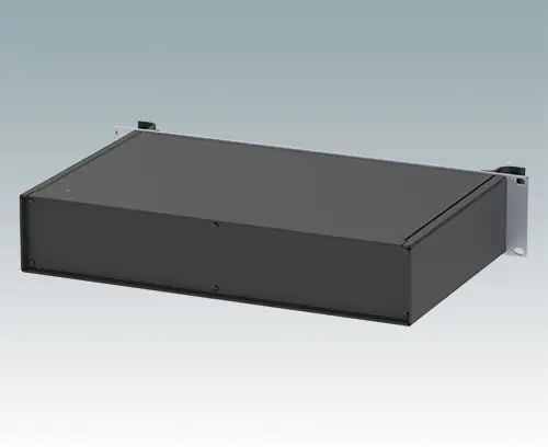 Universelles 19" Rack-Gehäuse mit eloxierten Alufrontblechen und zwei ergonomischen Frontblechgriffen. Der Alugehäusekörper besteht aus zwei Seitenblechen mit abnehmbaren Deck-, Boden- und Rückblechen. Das Bodenblech hat Montagelöcher für eine Leiterplatte oder die zugehörige Montageplatte. Für den elektrischen Anschluss sind alle Teile mit M4 Erdungsschrauben ausgestattet.