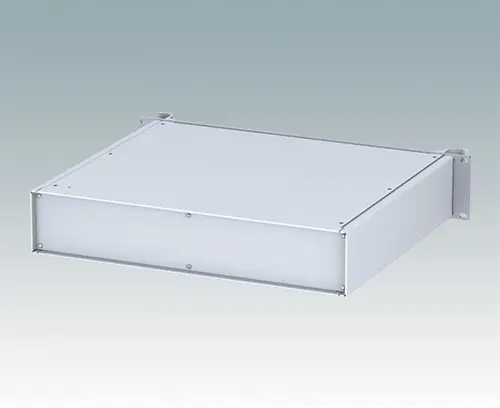 Universelles 19" Rack-Gehäuse mit eloxierten Alufrontblechen und zwei ergonomischen Frontblechgriffen. Der Alugehäusekörper besteht aus zwei Seitenblechen mit abnehmbaren Deck-, Boden- und Rückblechen. Das Bodenblech hat Montagelöcher für eine Leiterplatte oder die zugehörige Montageplatte. Für den elektrischen Anschluss sind alle Teile mit M4 Erdungsschrauben ausgestattet.