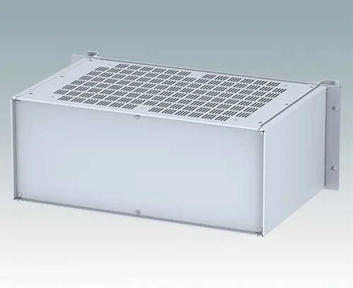 Universelles 19-Zoll-Rack-Gehäuse mit eloxierten Alufrontblechen und zwei ergonomischen Frontblechgriffen. Der Alugehäusekörper besteht aus zwei Seitenblechen mit abnehmbaren Deck-, Boden- und Rückblechen. Das Bodenblech hat Montagelöcher für eine Leiterplatte oder die zugehörige Montageplatte. Für den elektrischen Anschluss sind alle Teile mit M4 Erdungsschrauben ausgestattet.