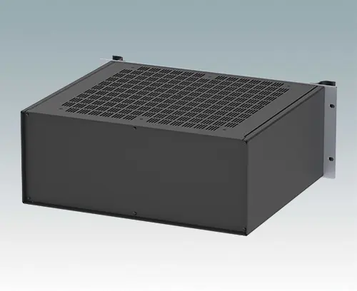 Universelles 19-Zoll-Rack-Gehäuse mit eloxierten Alufrontblechen und zwei ergonomischen Frontblechgriffen. Der Alugehäusekörper besteht aus zwei Seitenblechen mit abnehmbaren Deck-, Boden- und Rückblechen. Das Bodenblech hat Montagelöcher für eine Leiterplatte oder die zugehörige Montageplatte. Für den elektrischen Anschluss sind alle Teile mit M4 Erdungsschrauben ausgestattet.