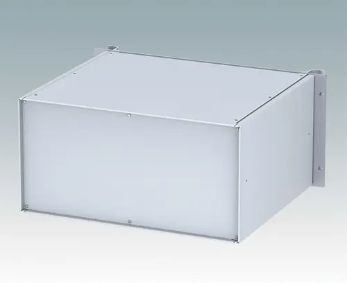 Universelles 19-Zoll-Rack-Gehäuse mit eloxierten Alufrontblechen und zwei ergonomischen Frontblechgriffen. Der Alugehäusekörper besteht aus zwei Seitenblechen mit abnehmbaren Deck-, Boden- und Rückblechen. Das Bodenblech hat Montagelöcher für eine Leiterplatte oder die zugehörige Montageplatte. Für den elektrischen Anschluss sind alle Teile mit M4 Erdungsschrauben ausgestattet.