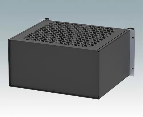 Universelles 19-Zoll-Rack-Gehäuse mit eloxierten Alufrontblechen und zwei ergonomischen Frontblechgriffen. Der Alugehäusekörper besteht aus zwei Seitenblechen mit abnehmbaren Deck-, Boden- und Rückblechen. Das Bodenblech hat Montagelöcher für eine Leiterplatte oder die zugehörige Montageplatte. Für den elektrischen Anschluss sind alle Teile mit M4 Erdungsschrauben ausgestattet.