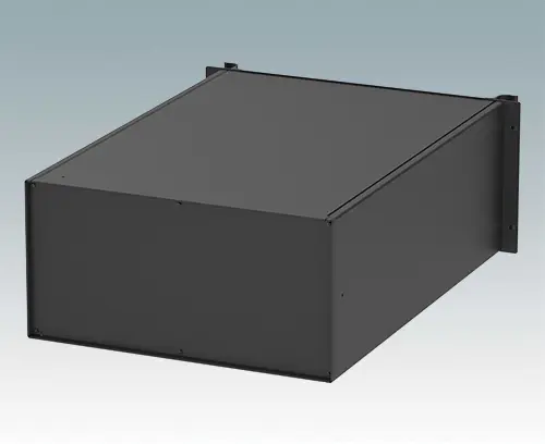 Universelles 19” Rack-Gehäuse mit Frontplatte in Aluminium schwarz lackiert und zwei ergonomischen Frontblechgriffen. Der Alugehäusekörper besteht aus zwei Seitenblechen mit abnehmbaren Deck-, Boden- und Rückblechen. Das Bodenblech hat Montagelöcher für eine Leiterplatte oder die zugehörige Montageplatte. Für den elektrischen Anschluss sind alle Teile mit M4 Erdungsschrauben ausgestattet.