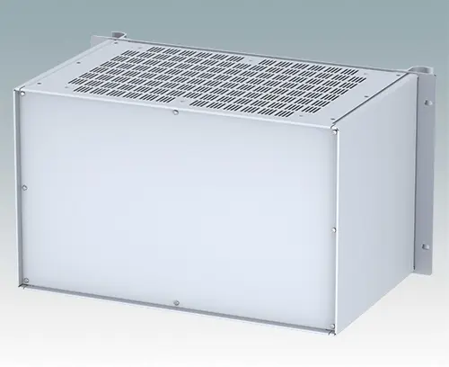Universelles 19-Zoll-Rack-Gehäuse mit eloxierten Alufrontblechen und zwei ergonomischen Frontblechgriffen. Der Alugehäusekörper besteht aus zwei Seitenblechen mit abnehmbaren Deck-, Boden- und Rückblechen. Das Bodenblech hat Montagelöcher für eine Leiterplatte oder die zugehörige Montageplatte. Für den elektrischen Anschluss sind alle Teile mit M4 Erdungsschrauben ausgestattet.