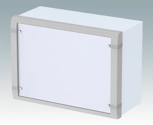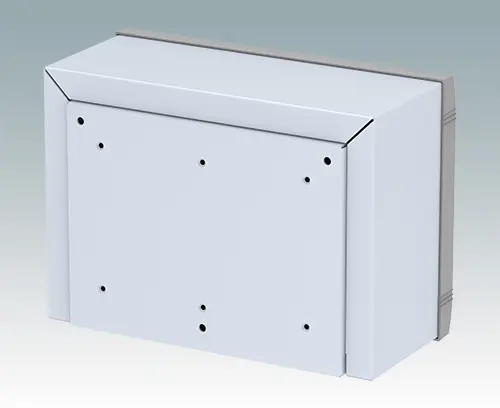 Moderne Aluminium-Gehäuse für Innenanwendungen. Elektronik während der Wandinstallation frei zugänglich. Elegantes Design mit Zink-Druckguss Frontrahmen, Haube und Rückplatte in L-Form. Front- und Montageplatten als Zubehör.