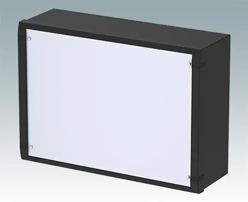Moderne Aluminium-Gehäuse für Innenanwendungen. Elektronik während der Wandinstallation frei zugänglich. Elegantes Design mit Zink-Druckguss Frontrahmen, Haube und Rückplatte in L-Form. Front- und Montageplatten als Zubehör.