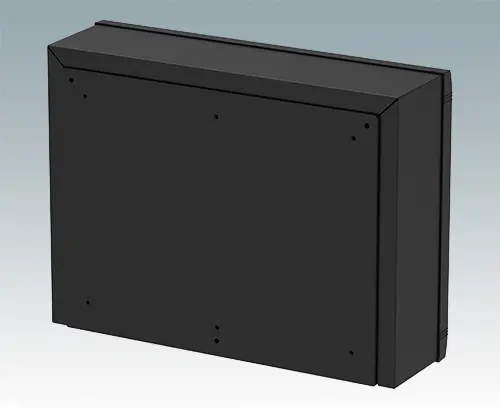 Moderne Aluminium-Gehäuse für Innenanwendungen. Elektronik während der Wandinstallation frei zugänglich. Elegantes Design mit Zink-Druckguss Frontrahmen, Haube und Rückplatte in L-Form. Front- und Montageplatten als Zubehör.