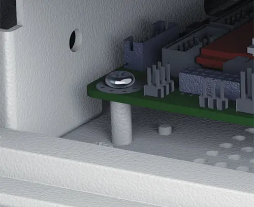 Diese Schrauben eignen sich auch zur Verwendung in Kombination mit dem M5600001 - Leiterplattenmontagesatz, um Leiterplatten an den Kunststoffmontagesäulen zu befestigen. Befestigungspunkte sind in den folgenden Beilagen für diesen Bausatz enthalten: COMBIMET 19", VERSAMET 19", UNIMET 19", UNIDESK, UNIMET, UNIMET-PLUS, DATAMET