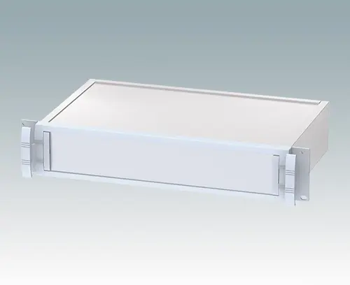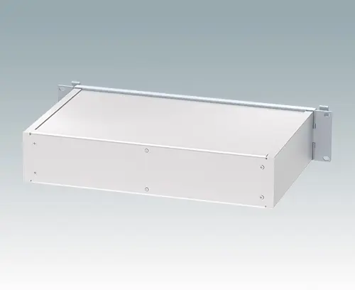 Modernes und robustes 19" Rack-Gehäuse mit integrierten „Komfortgriffen“. Vollständig aus Aluminium bestehende Konstruktion mit attraktivem Druckguss-Frontrahmen, profilierten Seitenplatten mit Leiterplatten-/Chassis-Führungen innen, Rückwand und flacher Deck- und Bodenplatte. Offene Frontplatte heißt, dass das Gehäuse nicht aus dem Rack genommen werden muss, um Zugriff auf die Elektronik zu haben. Die Bodenplatte ist gestanzt, um die Klappfüße (Zubehör) zu befestigen.