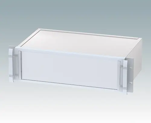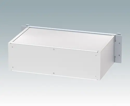 Modernes und robustes 19" Rack-Gehäuse mit integrierten „Komfortgriffen“. Vollständig aus Aluminium bestehende Konstruktion mit attraktivem Druckguss-Frontrahmen, profilierten Seitenplatten mit Leiterplatten-/Chassis-Führungen innen, Rückwand und flacher Deck- und Bodenplatte. Offene Frontplatte heißt, dass das Gehäuse nicht aus dem Rack genommen werden muss, um Zugriff auf die Elektronik zu haben. Die Bodenplatte ist gestanzt, um die Klappfüße (Zubehör) zu befestigen.