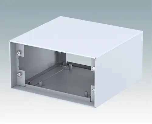 Moderne Instrumentengehäuse für Desktop- und portable Anwendungen. Die gefalzten Oberteile und Bodenplatten aus Aluminium werden unsichtbar von der Gehäuseunterseite montiert. Der Front und Rückplattenbereich ist um 8 bzw. 14 mm zurückversetzt. Front- und Rückplatten als Zubehör erhältlich.