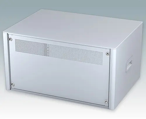 Das Gehäuse verfügt über eine Rückplatte, zwei ABS-Seitengriffe und vier ABS-Füße mit einsteckbare rutschfeste Gummifüße. Boden- und Rückplatte verfügen über Lüftungsschlitze. Interne Tragschienen für Baugruppenträger/Chassis.