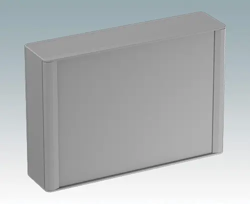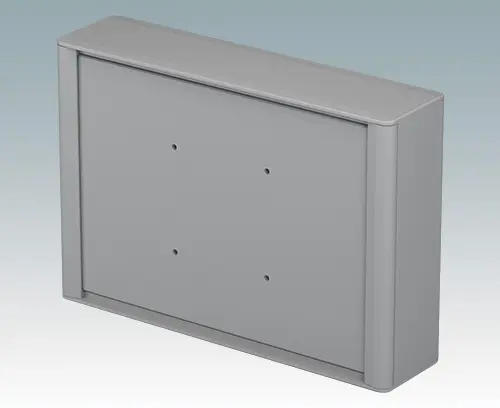 Modernes und äußerst attraktives Instrumentengehäuse aus Aluminium zur Aufnahme von Displays, Touchscreens und HMI-Elektronik. Auf der Rückseite sind VESA MIS-D 100-Befestigungspunkte vorhanden, um das Gerät an einem Standard VESA-Befestigungsarm oder einer Montagehalterung zu befestigen. Am Gehäusekörper aus Aluminium sind elegante Druckgussblenden vorne und hinten angebracht. Aufsteckbare Design-Blenden vorne und hinten verbergen alle Montageschrauben und sorgen für ein sehr professionelles Erscheinungsbild. Die Bodenplatte an der Unterseite bietet Platz für die Kabeleinführung. Im Inneren sind M3-Stehbolzen zur Leiterplattenmontage vorhanden. Die Montageprofile verfügen außerdem über M3-Gewinde und Führungsschienen zur Befestigung von Montageplatten. An allen Seiten sind M4-Erdungsbolzen angebracht; Einige Bolzen können auch mit Haltebändern verwendet werden, um die Vorder-/Rückwände während der Wartung zu halten. Frontplatten sind separat erhältlich. Zum Zubehör gehören ein Wandmontagesatz, eine Mastmontagehalterung und eine Montageplatte.