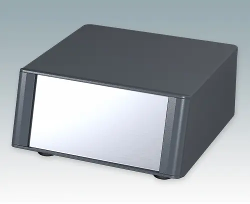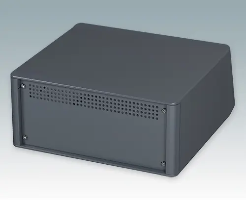 Moderne und äußerst attraktive Instrumentengehäuse mit geneigter Bedienfront für Tischanwendungen und Elektronik. Die eleganten Front- und Rückrahmen sind perfekt auf den Aluminiumgehäusekorpus abgestimmt. Design-Blenden (Front und Rückseite) verbergen die Montageschrauben sowie die Schrauben der Frontplatten und sorgen für eine professionelle Aufmachung. Das vormontierte interne Chassis verfügt über vier M3-Leiterplattenmontagebolzen im Boden. Das interne Chassis kann auch mit 5 Einschub-Leiterplatten ausgestattet werden dank der steckbaren Zubehör-Führung M6490020 (Bestellen Sie 2 Führungen pro Leiterplatte). Das Gehäuse verfügt über eine Rückplatte und vier ABS-Kippfüße. Boden- und Rückplatte verfügen über Lüftungslöcher. Die Frontplatten sind gesondert zu bestellen.