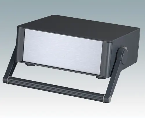Modernes und äußerst attraktives Instrumentengehäuse mit Handgriff / Bügelhandgriff für Tischanwendungen und den mobilen Einsatz. Die eleganten Front- und Rückrahmen sind perfekt auf den Aluminiumgehäusekorpus abgestimmt. Design-Blenden (Front und Rückseite) verbergen die Montageschrauben sowie die Schrauben der Frontplatten und sorgen für eine professionelle Aufmachung. Der Tragegriff kann in 30°-Stufen angepasst werden. Das vormontierte interne Chassis verfügt über vier M3-Leiterplattenmontagebolzen in der Bodenplatte. Das interne Chassis kann auch mit 5 Einschub-Leiterplatten ausgestattet werden dank der steckbaren Zubehör-Führung M6490010 (Bestellen Sie 4 Führungen pro Leiterplatte).