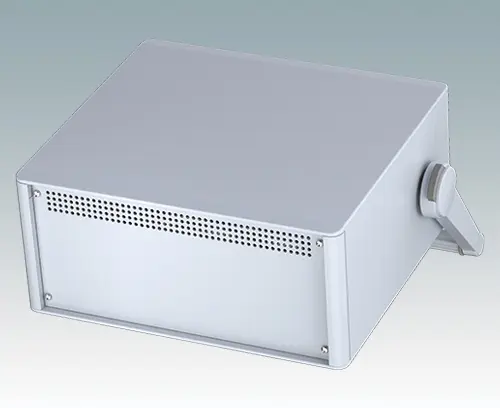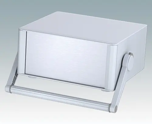 Modernes und äußerst attraktives Instrumentengehäuse mit Handgriff / Bügelhandgriff für Tischanwendungen und den mobilen Einsatz. Die eleganten Front- und Rückrahmen sind perfekt auf den Aluminiumgehäusekorpus abgestimmt. Design-Blenden (Front und Rückseite) verbergen die Montageschrauben sowie die Schrauben der Frontplatten und sorgen für eine professionelle Aufmachung. Der Tragegriff kann in 30°-Stufen angepasst werden. Das vormontierte interne Chassis verfügt über vier M3-Leiterplattenmontagebolzen in der Bodenplatte. Das interne Chassis kann auch mit 7 Einschub-Leiterplatten ausgestattet werden dank der steckbaren Zubehör-Führung M6490010 (Bestellen Sie 4 Führungen pro Leiterplatte).