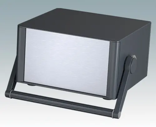 Modernes und äußerst attraktives Instrumentengehäuse mit Handgriff / Bügelhandgriff für Tischanwendungen und den mobilen Einsatz. Die eleganten Front- und Rückrahmen sind perfekt auf den Aluminiumgehäusekorpus abgestimmt. Design-Blenden (Front und Rückseite) verbergen die Montageschrauben sowie die Schrauben der Frontplatten und sorgen für eine professionelle Aufmachung. Der Tragegriff kann in 30°-Stufen angepasst werden. Das vormontierte interne Chassis verfügt über vier M3-Leiterplattenmontagebolzen in der Bodenplatte. Das interne Chassis kann auch mit 9 Einschub-Leiterplatten ausgestattet werden dank der steckbaren Zubehör-Führung M6490010 (Bestellen Sie 4 Führungen pro Leiterplatte).