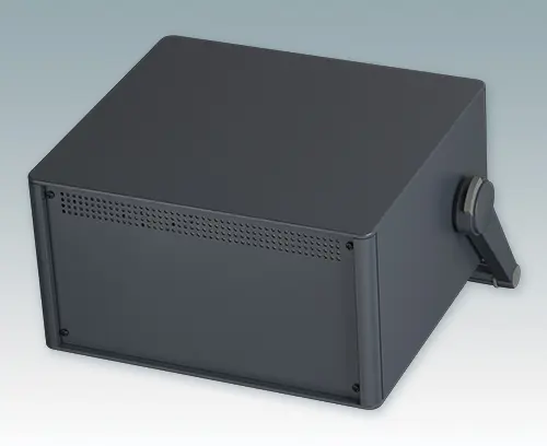 Das Gehäuse verfügt über eine Rückplatte und vier ABS-Kippfüße. Boden- und Rückplatte verfügen über Lüftungsschlitze. Die Frontplatten sind gesondert zu bestellen.