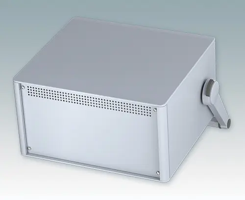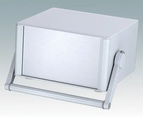 Modernes und äußerst attraktives Instrumentengehäuse mit Handgriff / Bügelhandgriff für Tischanwendungen und den mobilen Einsatz. Die eleganten Front- und Rückrahmen sind perfekt auf den Aluminiumgehäusekorpus abgestimmt. Design-Blenden (Front und Rückseite) verbergen die Montageschrauben sowie die Schrauben der Frontplatten und sorgen für eine professionelle Aufmachung. Der Tragegriff kann in 30°-Stufen angepasst werden. Das vormontierte interne Chassis verfügt über vier M3-Leiterplattenmontagebolzen in der Bodenplatte. Das interne Chassis kann auch mit 9 Einschub-Leiterplatten ausgestattet werden dank der steckbaren Zubehör-Führung M6490010 (Bestellen Sie 4 Führungen pro Leiterplatte).