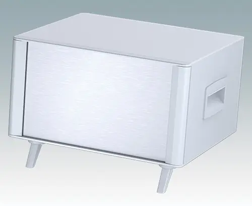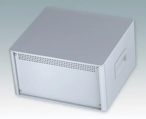 Das Gehäuse verfügt über eine Rückplatte, zwei ABS-Seitengriffe und vier einstellbare ABS-Füße. Boden- und Rückplatte verfügen über Lüftungsschlitze. Die Frontplatten sind gesondert zu bestellen.