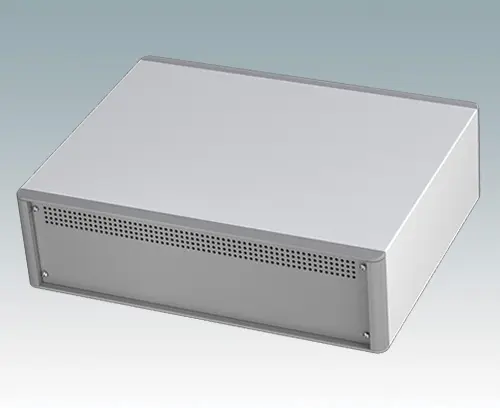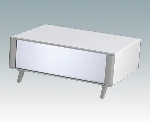 Das Gehäuse verfügt über eine Rückplatte und vier ABS-Kippfüße. Boden- und Rückplatte verfügen über Lüftungslöcher. Die Frontplatten sind gesondert zu bestellen.