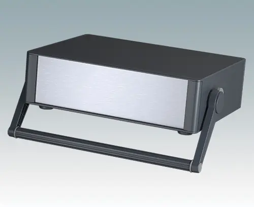 Modernes und äußerst attraktives Instrumentengehäuse mit Handgriff / Bügelhandgriff für Tischanwendungen und den mobilen Einsatz. Die eleganten Front- und Rückrahmen sind perfekt auf den Aluminiumgehäusekorpus abgestimmt. Design-Blenden (Front und Rückseite) verbergen die Montageschrauben sowie die Schrauben der Frontplatten und sorgen für eine professionelle Aufmachung. Der Tragegriff kann in 30°-Stufen angepasst werden. Das vormontierte interne Chassis verfügt über vier M3-Leiterplattenmontagebolzen in der Bodenplatte. Das interne Chassis kann auch mit 5 Einschub-Leiterplatten ausgestattet werden dank der steckbaren Zubehör-Führung M6490010 (Bestellen Sie 4 Führungen pro Leiterplatte).