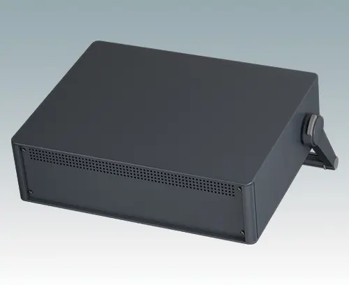 Das Gehäuse verfügt über eine Rückplatte und vier ABS-Kippfüße. Boden- und Rückplatte verfügen über Lüftungsschlitze. Die Frontplatten sind gesondert zu bestellen.