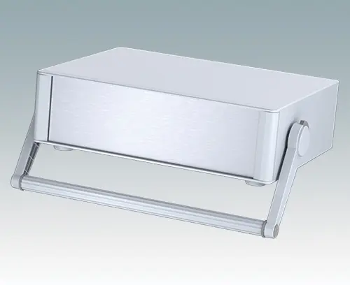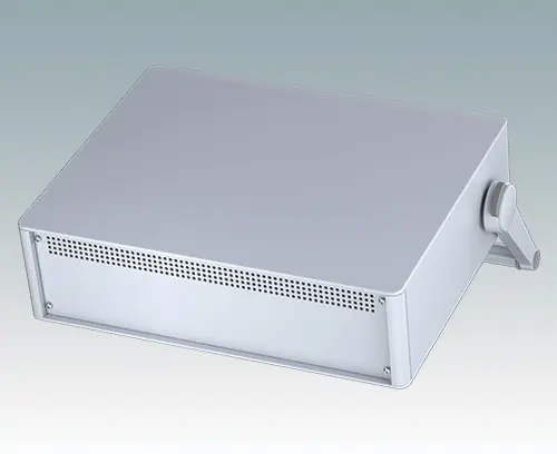 Modernes und äußerst attraktives Instrumentengehäuse mit Handgriff / Bügelhandgriff für Tischanwendungen und den mobilen Einsatz. Die eleganten Front- und Rückrahmen sind perfekt auf den Aluminiumgehäusekorpus abgestimmt. Design-Blenden (Front und Rückseite) verbergen die Montageschrauben sowie die Schrauben der Frontplatten und sorgen für eine professionelle Aufmachung. Der Tragegriff kann in 30°-Stufen angepasst werden. Das vormontierte interne Chassis verfügt über vier M3-Leiterplattenmontagebolzen in der Bodenplatte. Das interne Chassis kann auch mit 5 Einschub-Leiterplatten ausgestattet werden dank der steckbaren Zubehör-Führung M6490010 (Bestellen Sie 4 Führungen pro Leiterplatte).