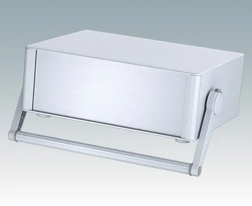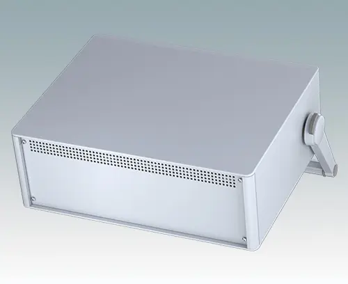Modernes und äußerst attraktives Instrumentengehäuse mit Handgriff / Bügelhandgriff für Tischanwendungen und den mobilen Einsatz. Die eleganten Front- und Rückrahmen sind perfekt auf den Aluminiumgehäusekorpus abgestimmt. Design-Blenden (Front und Rückseite) verbergen die Montageschrauben sowie die Schrauben der Frontplatten und sorgen für eine professionelle Aufmachung. Der Tragegriff kann in 30°-Stufen angepasst werden. Das vormontierte interne Chassis verfügt über vier M3-Leiterplattenmontagebolzen in der Bodenplatte. Das interne Chassis kann auch mit 7 Einschub-Leiterplatten ausgestattet werden dank der steckbaren Zubehör-Führung M6490010 (Bestellen Sie 4 Führungen pro Leiterplatte).