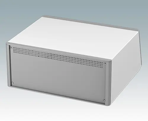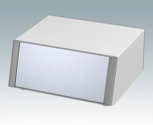 Modernes und äußerst attraktives Instrumentengehäuse mit abfallender Frontblende für Tischanwendungen und den mobilen Einsatz. Die eleganten Front- und Rückrahmen sind perfekt auf den Aluminiumgehäusekorpus abgestimmt. Design-Blenden (Front und Rückseite) verbergen die Montageschrauben sowie die Schrauben der Frontplatten und sorgen für eine professionelle Aufmachung. Das vormontierte interne Chassis verfügt über vier M3-Leiterplattenmontagebolzen im Boden. Das interne Chassis kann auch mit 9 Einschub-Leiterplatten ausgestattet werden dank der steckbaren Zubehör-Führung M6490010 (Bestellen Sie 4 Führungen pro Leiterplatte). Das Gehäuse verfügt über eine Rückplatte und vier einstellbare ABS-Füße. Boden- und Rückplatte verfügen über Lüftungsschlitze. Die Frontplatten sind gesondert zu bestellen.