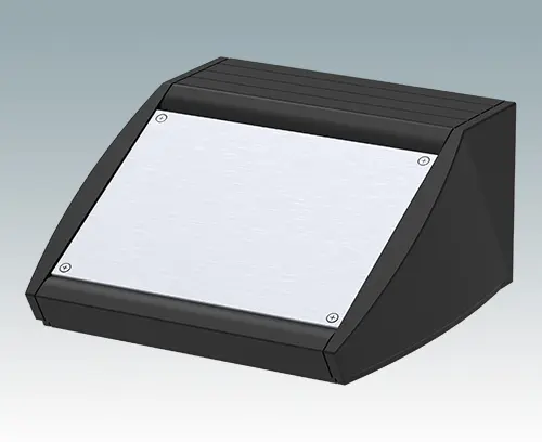 Pultgehäuse mit ergonomisch günstiger Bedienfront und Schutzart IP 54 für Tisch- oder Wandanwendungen. Vormontiertes Aluminium-Gehäuse mit abnehmbarer Bodenplatte. Für die Schutzart IP 54 ist es erforderlich, die Öffnungen der Bodenplatte mit dem Leiterkarten-Montage-Set M 56 00 001 oder eigenen Leiterkartenbefestigungen zu verschließen. Frontplatte als Zubehör.