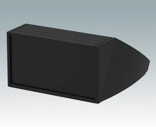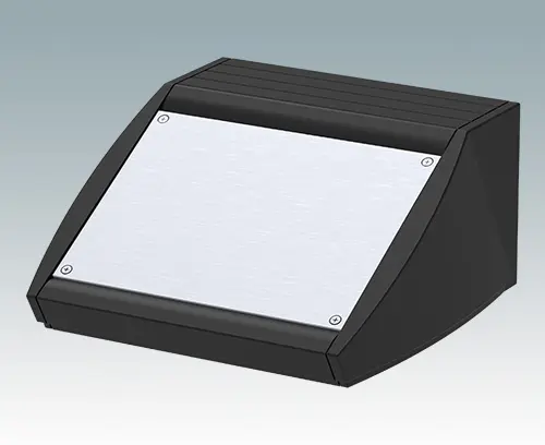 Pultgehäuse mit ergonomisch günstiger Bedienfront für Tisch- oder Wandanwendungen. Vormontiertes Aluminium-Gehäuse mit abnehmbarer Bodenplatte. Frontplatte als Zubehör.