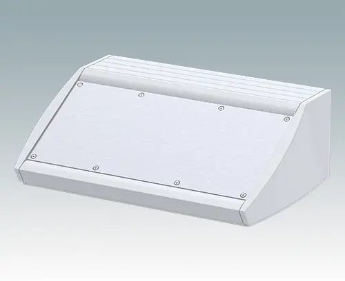 Pultgehäuse mit ergonomisch günstiger Bedienfront und Schutzart IP 54 für Tisch- oder Wandanwendungen. Vormontiertes Aluminium-Gehäuse mit abnehmbarer Bodenplatte. Für die Schutzart IP 54 ist es erforderlich, die Öffnungen der Bodenplatte mit dem Leiterkarten-Montage-Set M 56 00 001 oder eigenen Leiterkartenbefestigungen zu verschließen. Frontplatte als Zubehör.