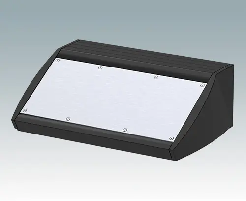 Pultgehäuse mit ergonomisch günstiger Bedienfront und Schutzart IP 54 für Tisch- oder Wandanwendungen. Vormontiertes Aluminium-Gehäuse mit abnehmbarer Bodenplatte. Für die Schutzart IP 54 ist es erforderlich, die Öffnungen der Bodenplatte mit dem Leiterkarten-Montage-Set M 56 00 001 oder eigenen Leiterkartenbefestigungen zu verschließen. Frontplatte als Zubehör.