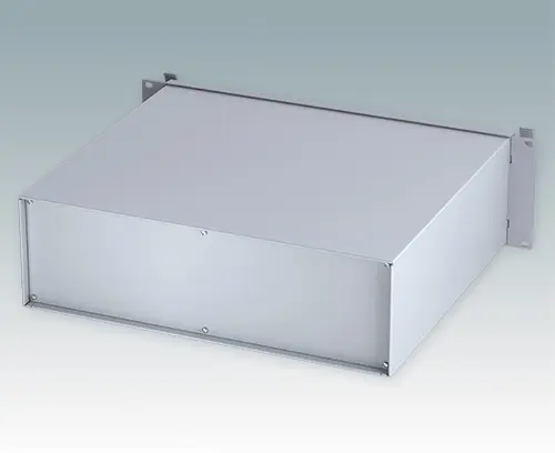 Modernes, hochwertiges 19" Rack-Gehäuse mit integrierten ‘Komfort-Griffen’. Aluminium-Konstruktion mit Druckguss-Frontrahmen, gekantetem Oberteil sowie abnehmbarer Boden- und Rückplatte für gute Zugänglichkeit. Frontplatten-Set als Zubehör.
