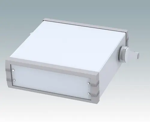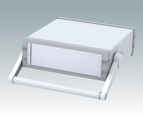 Modernes Aluminiumgehäuse mit Griffbügel für Tischanwendungen und den mobilen Einsatz. Vormontiertes Innenchassis mit vier Rastführungen für Leiterplatinen. Vier Standardführungspositionen – zusätzliche Positionen können auf Anfrage ausgestanzt werden. Elegante Front- und Rückrahmen passend zum vorgefertigten Gehäuseaufbau. Eine abnehmbare Rückplatte und vier selbstklebende rutschhemmende Füße sind inklusive. Frontplatten-Set als Zubehör.
