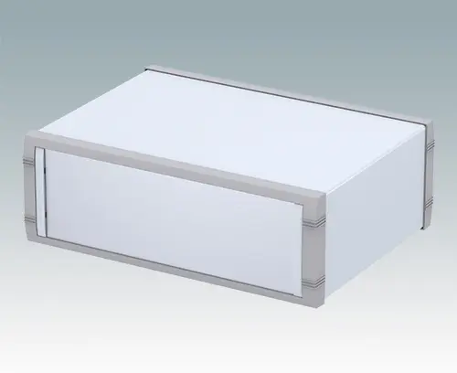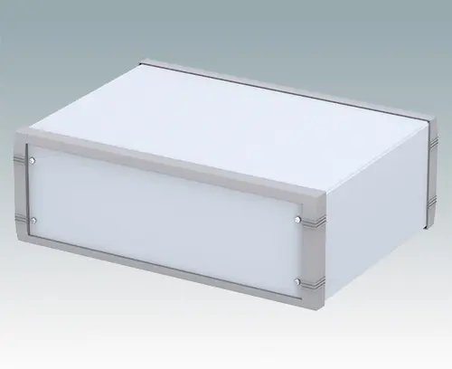 Modernes Aluminiumgehäuse für Tischanwendungen. Vormontiertes Innenchassis mit vier Rastführungen für Leiterplatinen. Vier Standardführungspositionen – zusätzliche Positionen können auf Anfrage ausgestanzt werden. Elegante Front- und Rückrahmen passend zum vorgefertigten Gehäuseaufbau. Eine abnehmbare Rückplatte und vier selbstklebende rutschhemmende Füße sind inklusive. Frontplatten-Set als Zubehör.