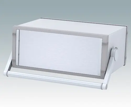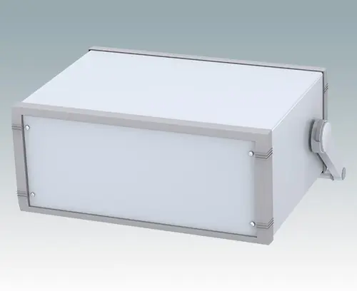 Modernes Aluminiumgehäuse mit Griffbügel für Tischanwendungen und den mobilen Einsatz. Vormontiertes Innenchassis mit vier Rastführungen für Leiterplatinen. Vier Standardführungspositionen – zusätzliche Positionen können auf Anfrage ausgestanzt werden. Elegante Front- und Rückrahmen passend zum vorgefertigten Gehäuseaufbau. Eine abnehmbare Rückplatte und vier selbstklebende rutschhemmende Füße sind inklusive. Frontplatten-Set als Zubehör.