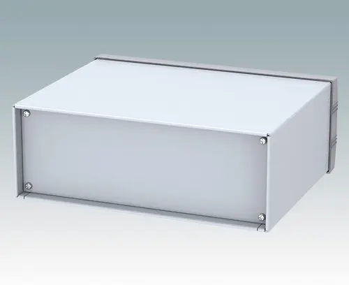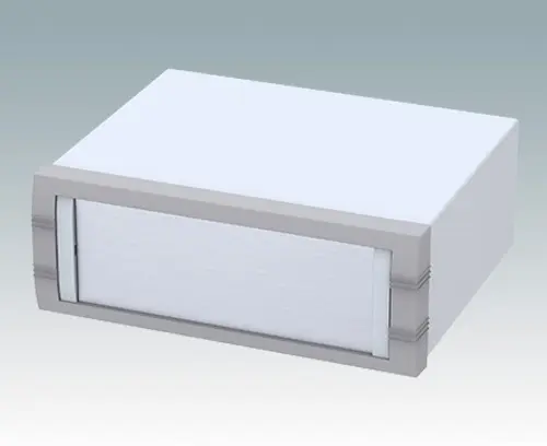 Modernes Instrumentengehäuse für Tischanwendungen oder mobilen Einsatz. Oberteil gekantet aus Aluminium mit Druckguss-Frontrahmen. Boden- und Rückplatten sind abnehmbar. Frontplatten-Set als Zubehör.