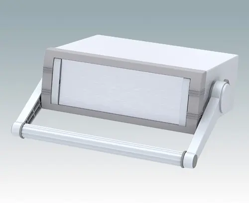 Modernes Instrumentengehäuse für Tischanwendungen oder mobilen Einsatz. Mit Griffbügel. Oberteil gekantet aus Aluminium mit Druckguss-Frontrahmen. Boden- und Rückplatten sind abnehmbar. Frontplatten-Set als Zubehör.