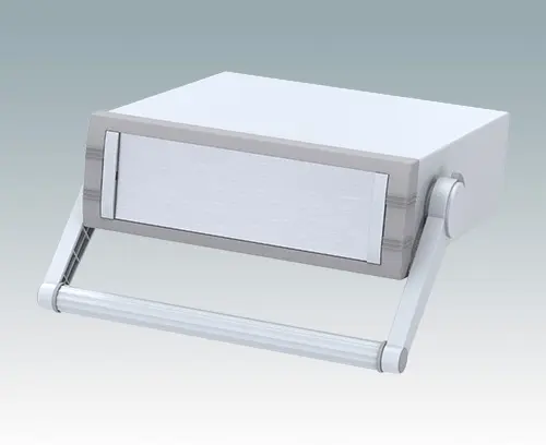 Modernes Instrumentengehäuse für Tischanwendungen oder mobilen Einsatz. Mit Griffbügel. Oberteil gekantet aus Aluminium mit Druckguss-Frontrahmen. Boden- und Rückplatten sind abnehmbar. Frontplatten-Set als Zubehör.