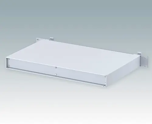 Modern und vielseitig einsetzbare 19" Rack-Gehäuse mit eloxierter Aluminium Frontplatte und integrierten 'Komfortgriffen'. Gehäuse aus Aluminium, gekantet. Alle Befestigungen auf der Unterseite. Abnehmbare Boden- und Rückplatte für guten Zugang